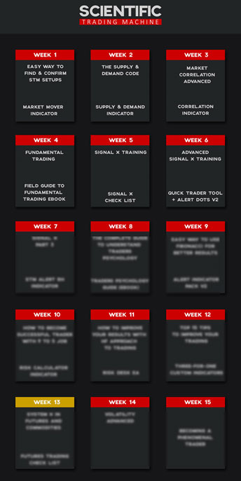 Эти мощные индикаторы - лишь некоторые из бонусов, которые вы получите с помощью STM, и небольшая часть того, что я собираюсь показать вам дальше...Дорожная Карта ТрейдеровЕсли вы действительно серьезно относитесь к тому, чтобы стать богатым трейдером, то вам нужен прочный фундамент, потому что...Без плана вы просто бросаете спагетти в стену, надеясь, что они прилипнут.Вы должны оставаться сосредоточенными на своей цели.Вот почему основой этой системы является 15-недельный план, предназначенный для того, чтобы в кратчайшие сроки превратить вас из новичка в профессионала.После десяти лет торговли, зарабатывания миллионов для своих клиентов и после того, как он помог тысячам людей научиться торговать, Никола знает, что нужно, чтобы сделать богатого трейдера из любого человека.Каждую неделю вам будет предоставляться новая информация, основанная на том, что вы узнали за неделю до этого.Никола возьмет тебя за руку и подробно расскажет о каждом шаге.И нет никакой необходимости спешить, потому что вся информация, которую Никола охватывает в этой дорожной карте трейдеров, доступна в области участника. Таким образом, вы можете работать в удобном для вас темпе.К тому времени, как вы закончите это обучение, у вас будут все инструменты и знания, чтобы стать неудержимым!